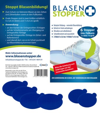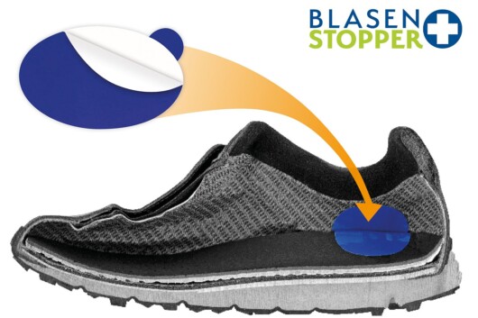 Mit dem BLASENSTOPPER bietet die Firma Sourceplan aus Landau eine Möglichkeit, die Reibung zu verhindern. Das Clevere am BLASENSTOPPER ist, dass die Klebepads direkt in den Schuh geklebt werden, nicht auf die Haut. Dadurch werden Hautirritationen vermieden. Außerdem halten die BLASENSTOPPER deutlich länger als bsp. Blasenpflaster. Die Klebepads bestehen aus dünnen Aufklebern mit einem hochwirksamen Klebstoff, der die Pads sicher in der Schuhinnenseite fixiert. Der hochwirksame Klebstoff auf der Unterseite des Aufklebers fixiert den BLASENSTOPPER sicher im Schuh.