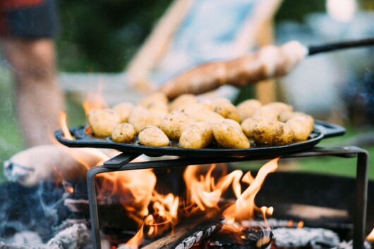 Wenn der Kartoffelbräter mit Gemüse bestückt ist, landen die Kartoffeln in der Petromax Poffertjespfanne. Richtig gelesen: Statt süßem Gebäck wird die gusseiserne Form für das herzhafte Hauptgericht genutzt. Ein Pfannenknecht macht aus dem Lagerfeuer eine sichere Kochstelle. Auf der stabilen Abstellfläche steht die spezielle Gusseisenpfanne direkt über den Flammen. In ihren Mulden brutzeln 30 kleine Kartoffeln gleichzeitig im Feuer. Die Poffertjespfanne profitiert dabei von den Eigenschaften des hochwertigen Petromax Gusseisens. Durch die typische Patina entsteht bei jedem Gebrauch eine natürliche Antihaftbeschichtung. Sie sorgt dafür, dass die Kartoffeln ohne zusätzliches Fett auskommen und gleichzeitig nicht anbrennen.
