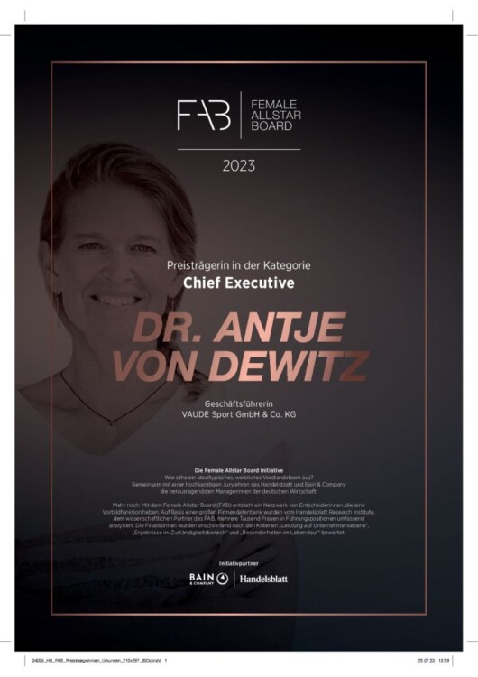 Im Rahmen des Wandels hat sich Antje von Dewitz auch intensiv damit befasst, wie mehr Frauen für Führungspositionen gewonnen werden können. Sie hat eine Vertrauenskultur im Unternehmen verankert, die ein Miteinander auf Augenhöhe, Diversität und Selbstwirksamkeit fördert. Zudem wurden Rahmenbedingungen geschaffen, die die Vereinbarkeit von Beruf und Privatleben für alle Mitarbeitenden vereinfachen und auch geteilte Familienverantwortung fördern. Heute liegt der Anteil weiblicher Führungskräfte bei VAUDE bei über 40 Prozent. Damit ist VAUDE eine Ausnahme. Antje von Dewitz spricht sich daher auch klar für eine Frauenquote in den Chefetagen der deutschen Wirtschaft aus, denn auf freiwilliger Basis tut sich zu wenig. „Im Sinne einer starken, zukunftsfähigen Wirtschaft brauchen wir mehr Frauen in Verantwortung! Heterogene Teams, die unterschiedliche Perspektiven vereinen, befördern die Zukunftsfähigkeit, indem sie die besten und tragfähigsten Lösungen hervorbringen. Diese Erfahrung machen wir auch bei VAUDE“, betont Antje von Dewitz, die digital an der Preisverleihung teilnahm.