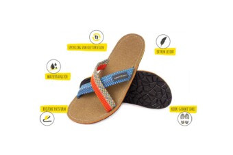 Ob als zweiter Schuh für eine Backpacking-Tour, den Stadtrundgang, für den Zustieg zum Kletterfelsen oder beim Sichern - der Dog-X aus Upcycling-Kletterseilen bietet ein angenehmes Tragegefühl und einen sicheren Halt. Die Sandale überzeugt besonders durch einen durchdachten mehrschichtigen Dämpfungsaufbau. Dieser besteht aus der stark profilierten Kork-Gummisohle, einer EVA-Dämpfung mit zusätzlichen Dämpfungskissen im Fersenbereich, sowie dem Obermaterial aus natürlichem Kork. Durch den Korkanteil in der Sohle wird die nachhaltige Sandale nicht nur leichter, sondern hat auch einen entscheidenden ökologischen Vorteil, da die normalerweise benötigte Menge an Gummi reduziert werden kann.
