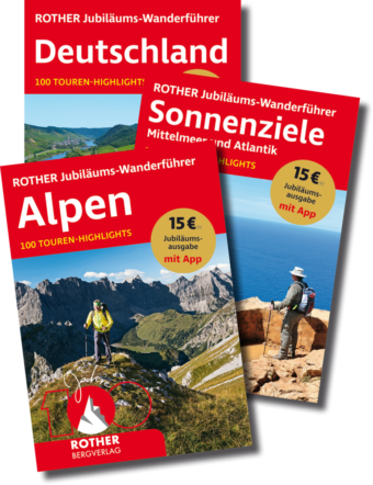 Zum 100-jährigen Jubiläum 2020 haben Rother-Autoren ihre Lieblingstouren verraten. In drei hochwertigen Sonderausgaben präsentieren sie die jeweils 100 schönsten Touren in den Alpen, in Deutschland und an sonnenreichen Urlaubszielen. Die passende Rother Touren App gibt es gratis dazu.