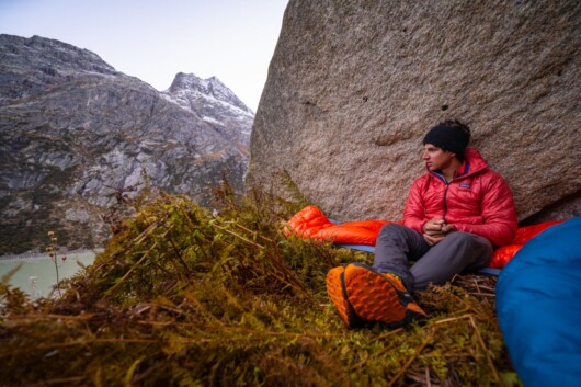 Dort wurde es richtig kalt, als mit der Morgendämmerung ein beißender Wind ins Tal trieb. Ich war froh, dass ich beim Auto in Handegg zwei warme Jacken anziehen konnte und machte eine längere Pause. Ich frühstückte und wartete auf das Tageslicht, um die Route „Fair Hands Line“ ohne Stirnlampe klettern zu können. Die aufgehende Sonne tauchte die Berge in tiefrotes Licht. Es war atemberaubend. Mit frischer Energie und dem Wissen, dass noch ein ganzer Tag für die zweite Hälfte des Projekts übrig war, hatte ich ein sehr gutes Gefühl.