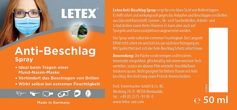 Info aus dem Hause Eimermacher: Das LETEX Anti Beschlag Spray verhindert das Beschlagen von Brillen und eignet sich ideal beim Tragen einer Mund-Nasen-Maske