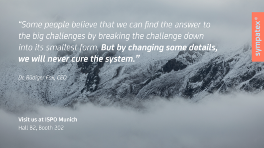 „Einige Leute glauben, dass wir die Antwort auf die großen Herausforderungen finden können, indem wir die Herausforderung in ihre kleinste Form herunterbrechen. Aber durch die Veränderung einiger Details werden wir das System niemals heilen“, Dr. Rüdiger Fox, CEO Sympatex. „Langlebigkeit wird unsere Lizenz zum Handeln, während Design für Recyclingfähigkeit unsere Industrie verändern wird“, ergänzt Fox.