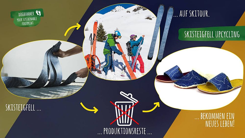Mit dem Upcycling Projekt zeigen Contour und Doghammer, dass Firmen aus der Outdoorbranche einen ökologisch schmalen Fußabdruck hinterlassen können. Aus den Verschnittresten der Contour Skifellproduktion produziert Doghammer das Riemen- und Schaftmaterial der Hüttenschuhe. Was also eigentlich im Müll landen würde, wird so einer neuen Verwendung zugeführt. Die sinnvoll verwerteten Materialreste von Contour kombinieren Sinn und Stil, indem sie den Doghammer Hüttenschuhen einen einzigartigen Look verleihen.Doghammer Hüttenschuhe – Lässig und nachhaltig