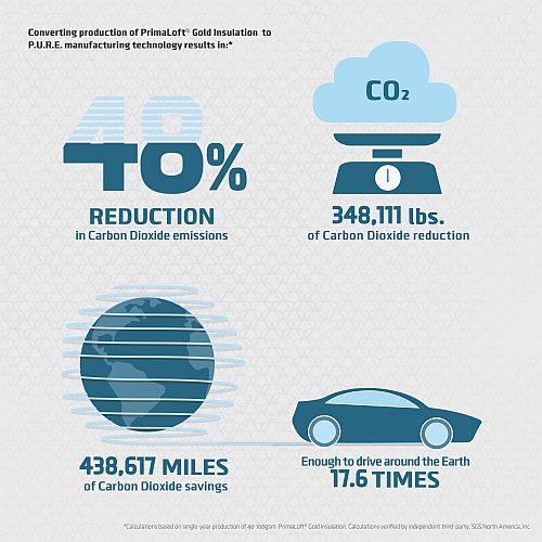 „Als verantwortungsbewusstes Unternehmen ist es uns ein Anliegen, Innovationen nicht nur auf der Produktebene voranzutreiben“, so PrimaLoft-Präsident und CEO Mike Joyce. „In den letzten vier Jahren haben wir an der Entwicklung von Verfahren gearbeitet, mit denen wir unsere CO2-Emissionen drastisch reduzieren können. Das Ergebnis ist eine geniale Veränderung unseres Produktionsprozesses, die unseren CO2-Fußabdruck signifikant verringert.“Die ersten Isolationen, die im PrimaLoft® P.U.R.E.™-Verfahren hergestellt werden, bestehen zu 100% aus Recyclingmaterial und verfügen über dieselben Isolations- und Leistungsmerkmale wie die bewährte PrimaLoft® Gold Insulation. Die Umstellung einer gesamten Jahresproduktion dieses Produkts auf das PrimaLoft® P.U.R.E.™- Verfahren bedeutet in Zahlen: