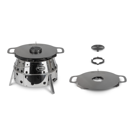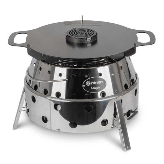 Petromax erweitert das Grill- und Kochvergnügen auf dem Atago um eine Grillplatte mit passendem Grilleinsatz und Kochaufsatz. Mit der Stahlplatte made in Germany im Abenteurer-Format wird der Petromax Allrounder im Handumdrehen zu einem Plancha-Grill für noch mehr Vielseitigkeit in der Draußen-Küche. In den unterschiedlichen Temperaturzonen garen auf der Grillplatte verschiedenste Speisen wie deftiges Fleisch oder mariniertes Gemüse gleichzeitig. Mit dem passenden Kochaufsatz für die Aussparung in der Mitte werden Kasserolle, Emaille-Stieltopf, Kessel oder Perkolator direkt über den Flammen positioniert. Auf dem Mini-Grillrost bekommt das Grillgut über züngelnden Flammen die typischen Grillstreifen.
