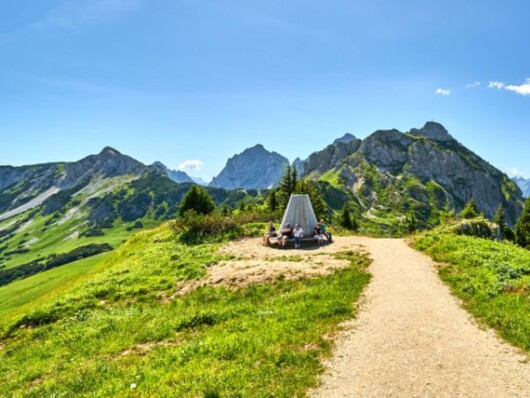 Auf etwa 1.100 Metern Höhe breitet sich im Talboden eine sanfte Wanderlandschaft aus. Breite, gut begehbare Wege laden zu gemütlichen Touren ein – ideal für alle, die es ruhig angehen lassen möchten. Die unterste Ebene folgt dem Verlauf des Tals und bietet flache Strecken ohne große Höhenunterschiede: Sie führen durch weite Naturlandschaften, vorbei an kleinen Kapellen und gemütlichen Gaststätten. Besonders schön ist der Rundweg um den Haldensee. Mitten im Naturschutzgebiet Vilsalpsee wird jeder Schritt zum stillen Genuss – mit Blick auf Wasser, Wälder und ein eindrucksvolles Bergpanorama. Eine empfehlenswerte, kinderwagengerechte Route verläuft entlang des Vilsalpsees zur Vilsalpe. Wer ohne Kinderwagen unterwegs ist, kann noch bis zum beeindruckenden Bergacht Wasserfall weitergehen. Der Buchstabenweg bei Jungholz dagegen eignet sich besonders gut für Familien. Auf der rund sieben Kilometer langen Runde können große und kleine Wanderer die künstlerisch gestalteten Buchstaben des Ortes Jungholz bewundern. Entspannt und ohne große Anstrengung durch die Natur – hier finden sich ideale Bedingungen für Familien, Wanderfreunde jeden Alters oder alle, die einfach nur die Ruhe genießen wollen.